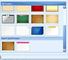 ![]() Neben Standard Templates stehen auch Kalender Templates zur Verfügung, die ausgefallene Rahmendesigns für Kalender zur Verfügung stellen. Es stehen über 20 Designs zur Verfügung. Bei Bedarf können eigene Designs eingeladen werden, die dann genauso wie die Standard Designs benutzt werden können. |