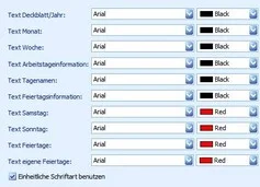 ![]() Die Schriftarten und Farben der einzelnen Kalenderobjekte (z.B. Monat, Jahr, Tage, Feiertagsinformationen usw) können frei formatiert werden. Bei Bedarf kann durch das Ändern einer Schriftart alle anderen Textobjekte auf die gleiche Schriftart geändert werden. |